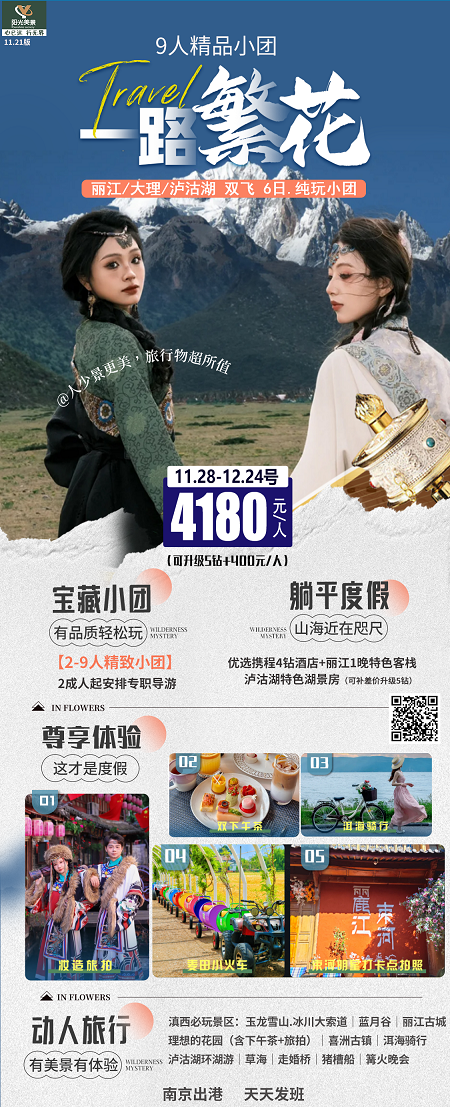 1、住宿:全程携程 4 钻酒店+泸沽湖升级湖景房,双标间;酒店不提供自然单间,产生单房