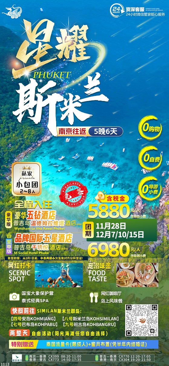 酒店享用早餐后,乘快艇前往【SIMILAN斯米兰群岛】,斯米兰群岛一共有9个岛,其中我们挑选了最美丽的4个岛,去尽情的游泳与浮潜,同时可以在银白色的沙滩上自由活动。斯米兰岛的美丽是无法用言辞来形容的,只有您的亲身体验,才能感受它的独特魅力。