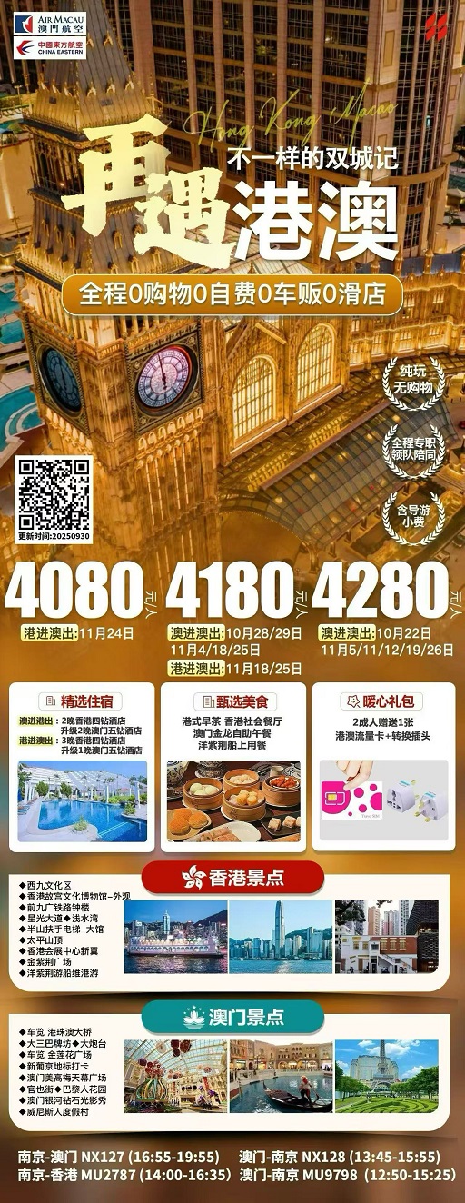 第五天:香港—澳门 南京 参考航班: NX128(13:40-15:55)