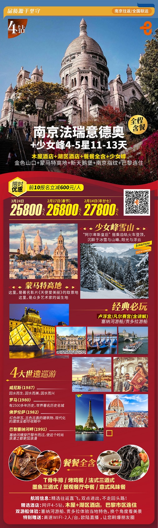 质品南京德国奥地利法国瑞士意大利少女峰12天9晚CDG-MXP(4钻)