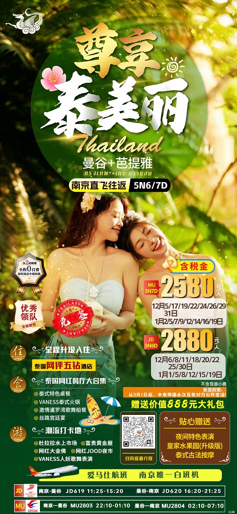 早餐后前往【大皇宫】这里汇集了泰国建筑、绘画、雕刻和装潢艺术的精粹。【玉佛寺】是全泰国唯一没有僧侣住持的 佛寺,但供奉着一座价值连城的国宝――由整块翡翠雕成的玉佛。(如因泰国政府公告关闭大皇宫及玉佛寺更换为 72 府)【金 山寺-天梯佛塔】它位于 78 米高的金山上。山顶的金山寺是泰国著名的佛寺,有 300 多年的历史,穿过丛林登上 318 阶梯的 旋转楼梯至山顶,一览曼谷全城风景。塔内珍藏有释迦摩尼佛的一颗舍利,从而也成为泰国乃至东南亚的佛教胜地,但前来 的游客不多,显得更加低调和宁静,不仅文化底蕴深厚也是小众拍照胜地,绝对是一个避开人挤人的团队游景点的首选之地。 【坐长尾船观网红大金佛】(游览约60 分钟)坐长尾船乘风破浪狂飙湄南河。船观:郑王庙、关帝庙、大金佛曼谷新地标— —耗资6 亿铢打造的69 米高的大佛,它是座皇家寺庙,坐落于曼谷的湄南河畔,在佛塔的最顶层有一座透着佛光的翡翠琉璃 佛塔,里面供奉着泰国九大圣僧之一龙婆术大师的佛骨舍利。欣赏【VANESSA人妖秀】(游览约60 分钟)欣赏享誉全球的泰 国国粹,雌雄难辨,精彩纷呈的演出,保证让你终身难忘。