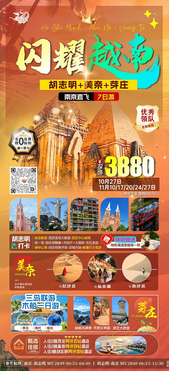 10-11月【越南:胡志明 美奈 头顿 芽庄 河内 南京直飞】线路报价