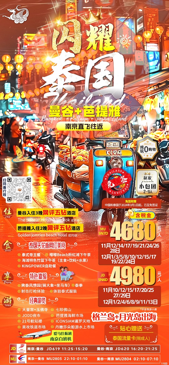早餐后驱车续往【格兰岛+月光岛】约 260 分钟位于印度半岛和马来半岛间的暹罗湾处,市区 面积 20 多平方公里,风光旖旎,气候宜人,年均温度 20 摄氏度左右。距离芭提雅 9 公 里处的珊瑚岛,是芭堤雅海滩外最大的岛,岛的四周有很多沙滩,沙白细棉,水清见底。 格兰岛又称可兰岛、珊瑚岛或者金沙岛,位于泰国春武里府芭堤雅,在这里可以饱览海 底奇景,海水清澈,礁石、小鱼、海蜇等等尽收眼底;水上娱乐项目繁多,游客可选择 新鲜刺激的海上降落伞项目(途经水上平台)、体验潜水、香蕉船、海底漫步、骑摩托 艇等等, 费用自理。