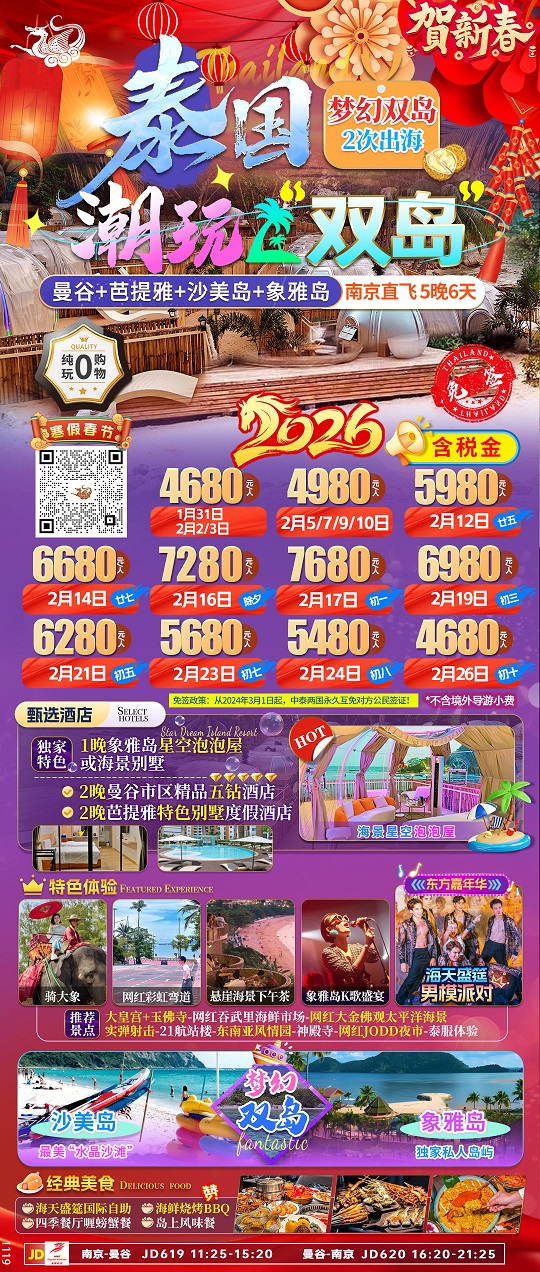 乘坐快艇前往【象雅岛】海域(快艇时间约8-15 分钟),开启你的专属海岛时光--象雅岛之旅。 这是一个全新的岛屿,泰国“独一无二 ”的一岛一酒店的海岛。象雅岛拥有高端奢华的岛上海景 别墅、时尚浪漫与自然和谐共生的星空泡泡屋。打造了时尚与奢华的独家视觉体验,让游客真正 体验到一岛之主的尊贵感!这里有茂密的海岛植被,是海岛雨林探奇的好去处!这里可以亲切地 体会到极少有的海岛鸟语花香!海底珊瑚和热带海底生物是这神秘海岛永久的哨兵!海岛独有的 韵味只有身在其中才能细品其境!