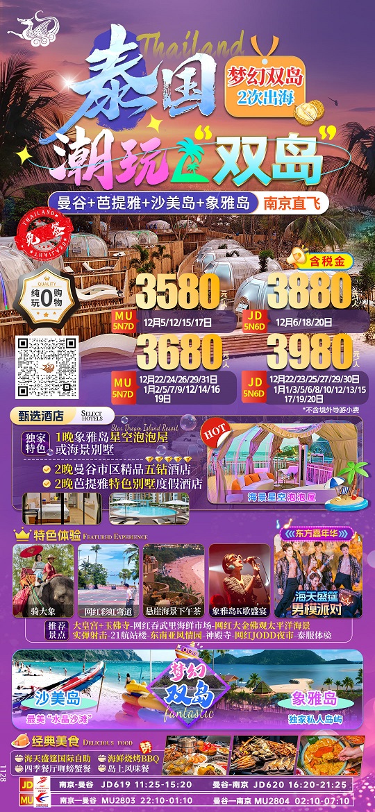 当前位置:首页 >> 国内长线 >> 12月-1月【潮玩双岛:泰国曼谷芭提雅+沙美岛+象雅岛6-7日游 纯玩0购物】3580元起