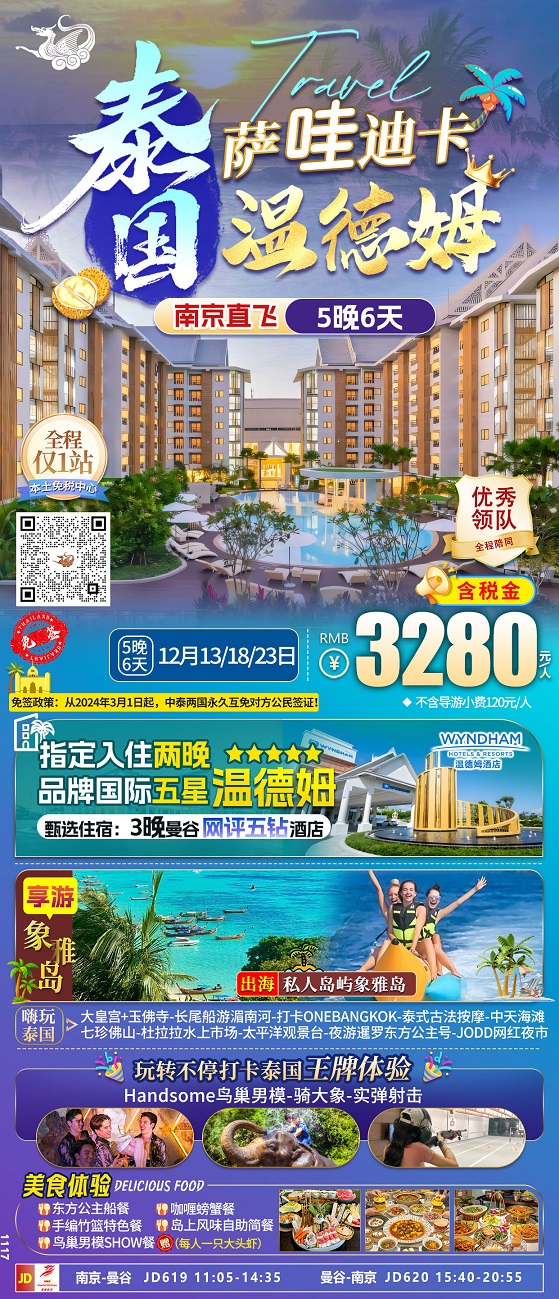 各位团友于南京禄口机场集合,由专人为您办理登机手续,怀着愉悦的心情搭乘国际航班前往微笑 国度,泰国首都-曼谷市。抵达后乘旅游巴士前往酒店休息,养精蓄锐,来迎接未来几天丰富有趣的行 程。