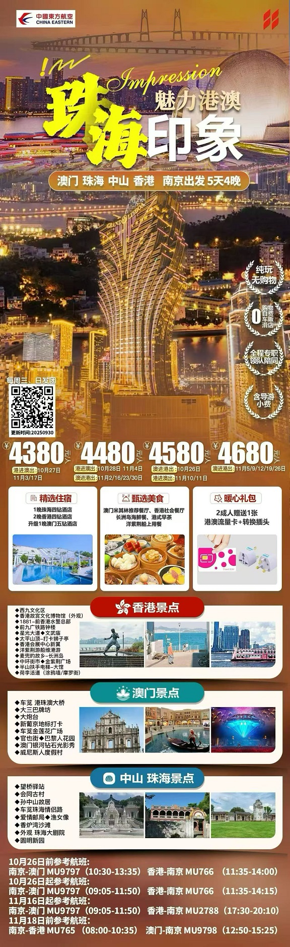 第一天:南京 澳门 参考航班: MU9797 (10:30-13:35)