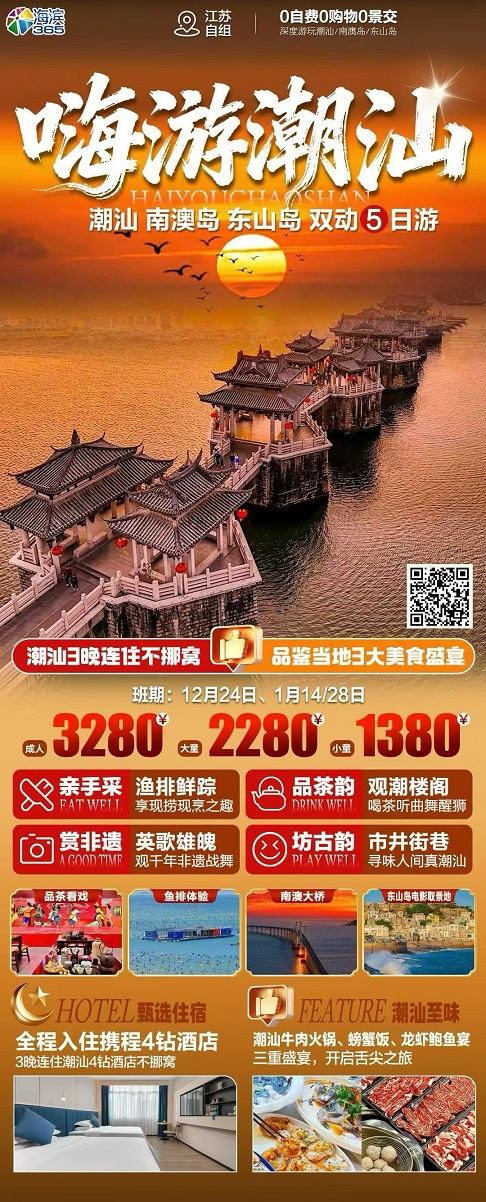 【江苏自组潮汕双飞5日游: 潮州汕头+1晚南澳岛海景房 0购物0自费】.行程