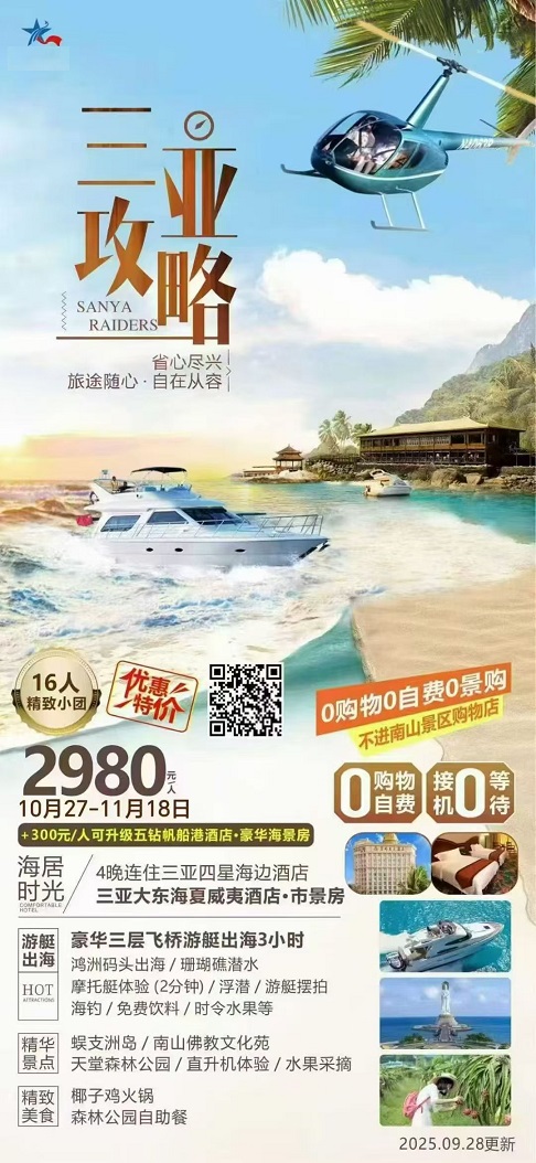 2、特别提示:岛屿类(蜈支洲岛、分界洲岛、西岛等)景区规定60岁以上及行动不便游客(包括孕妇)需写景区的免责声明方可登船上岛;70周岁以上老年人出于安全考虑,景区可以会拒接,请慎重选择。另外所有行程孕妇不予接待望周知!