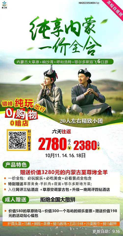 10月【内蒙古:呼和浩特 鄂尔多斯 响沙湾 希拉穆仁草原 呼伦贝尔草原】线路及报价