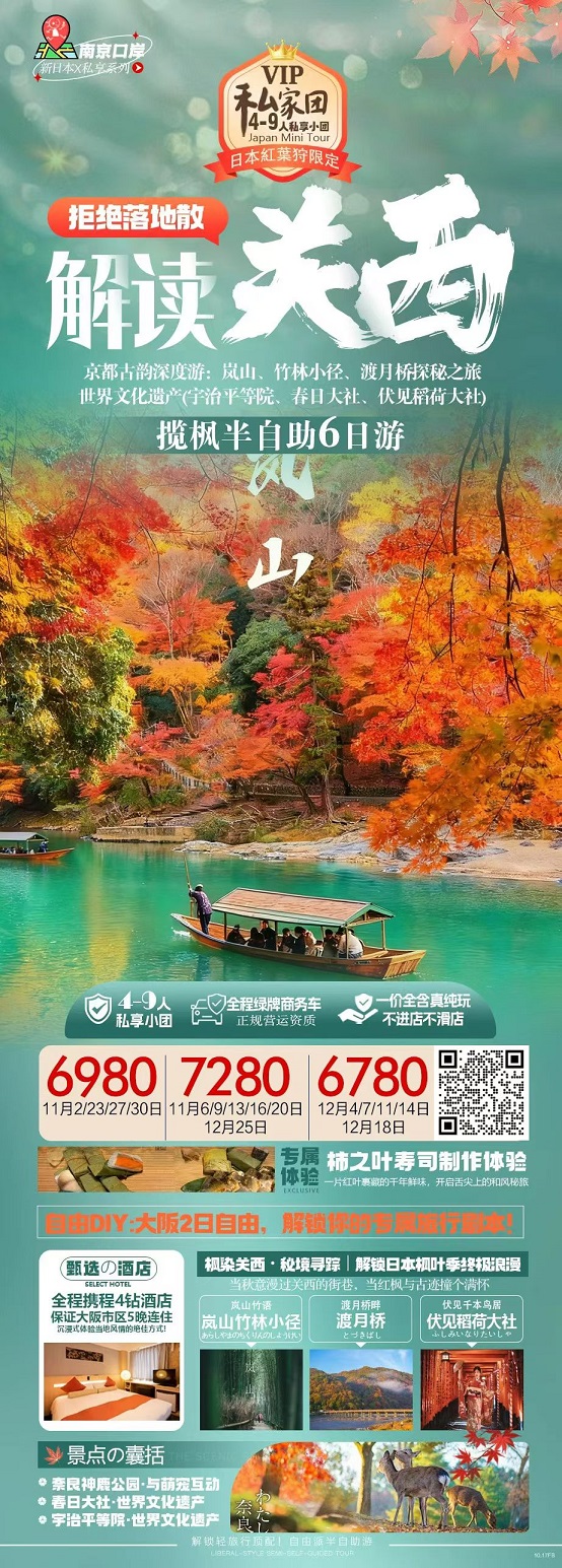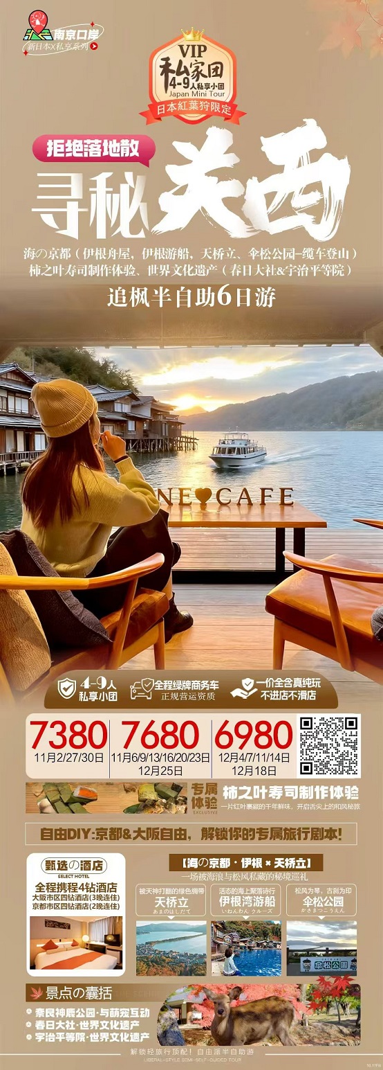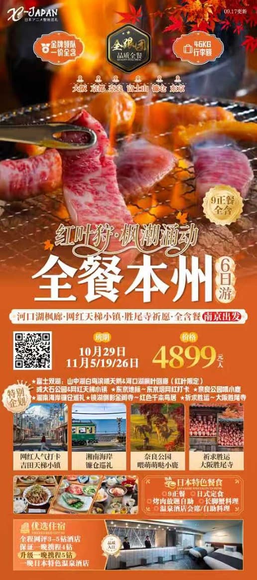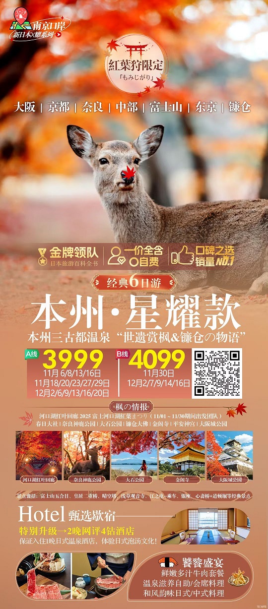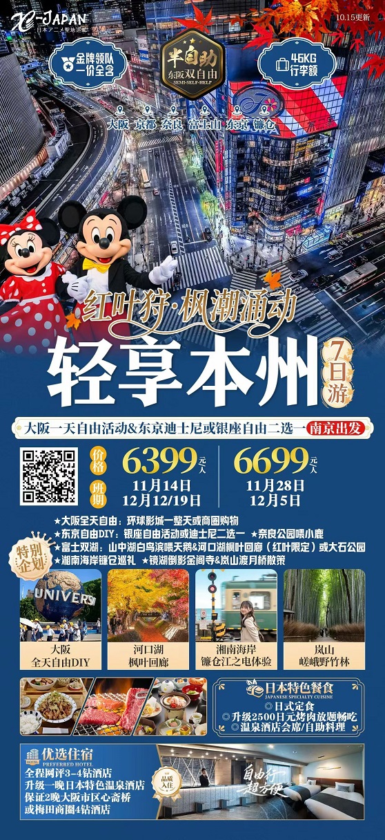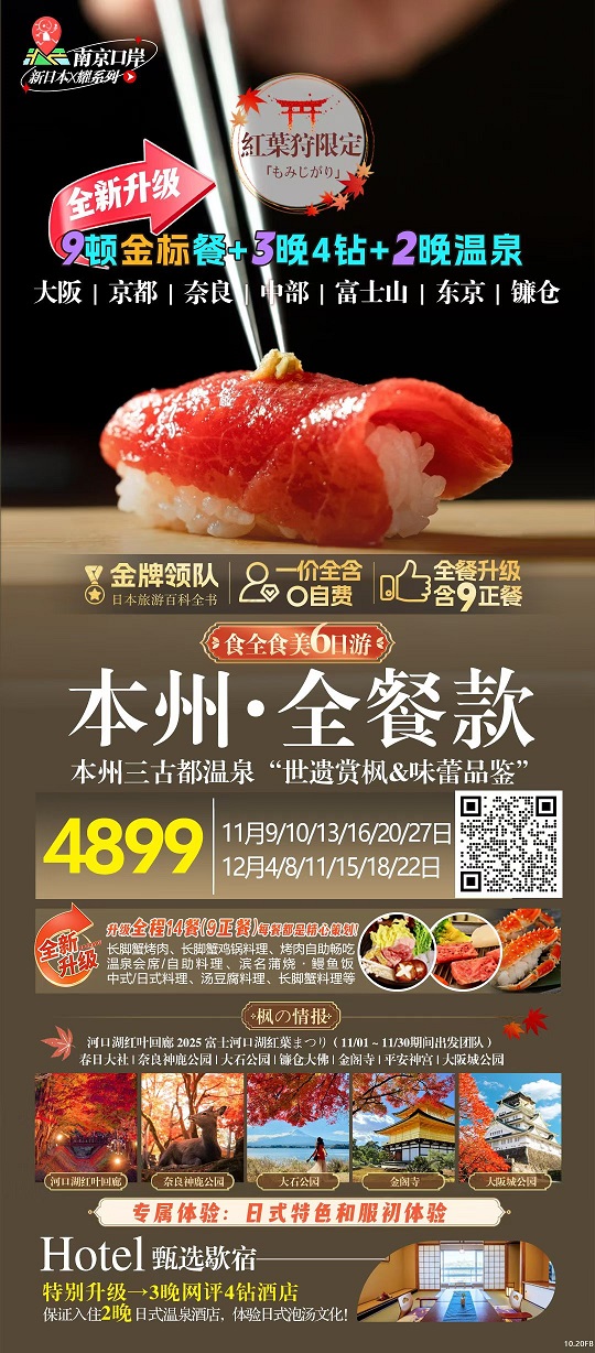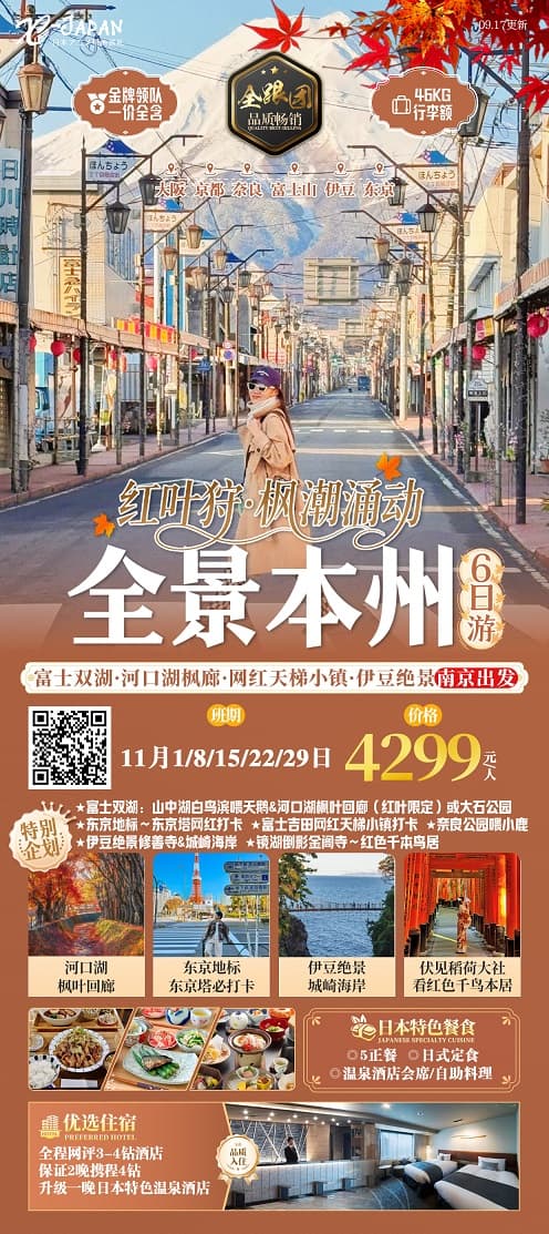 【本州全餐款:日本本州三古都温泉+日本红叶季6日游 升级全含餐】.行程