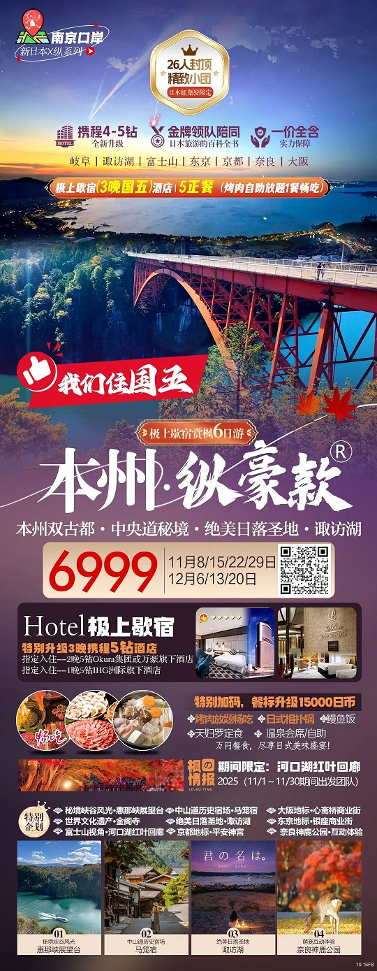 【本州星耀款:日本本州三古都温泉+世遗赏枫6日游】.行程