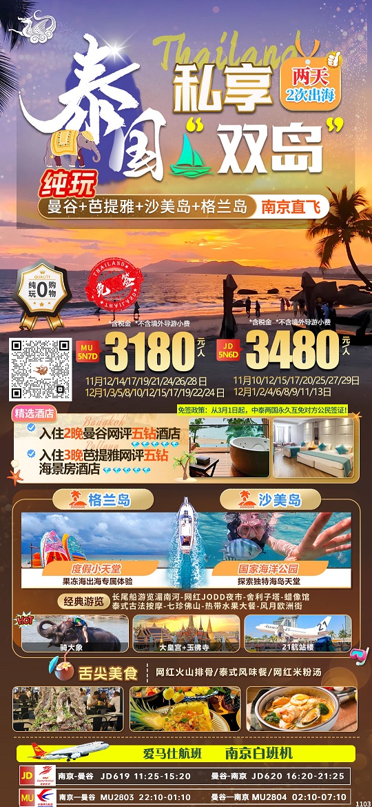 嗨玩泰国 :大皇宫、 21 航站楼、沙美岛+格兰岛两次出海、泰国三大奇观、 网红 JODD 夜市、拜大金佛 观太平洋无敌海景、热带水果大餐  、泰式古法按摩