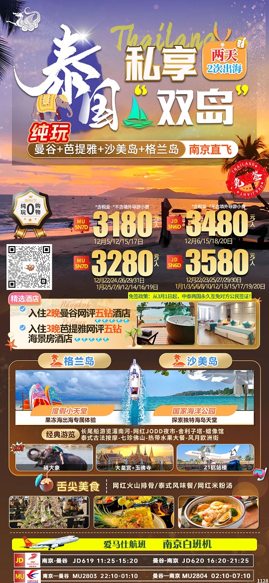 嗨玩泰国 :大皇宫、 21 航站楼、沙美岛+格兰岛两次出海、泰国三大奇观、 网红 JODD 夜市、拜大金佛 观太平洋无敌海景、热带水果大餐 、泰式古法按摩