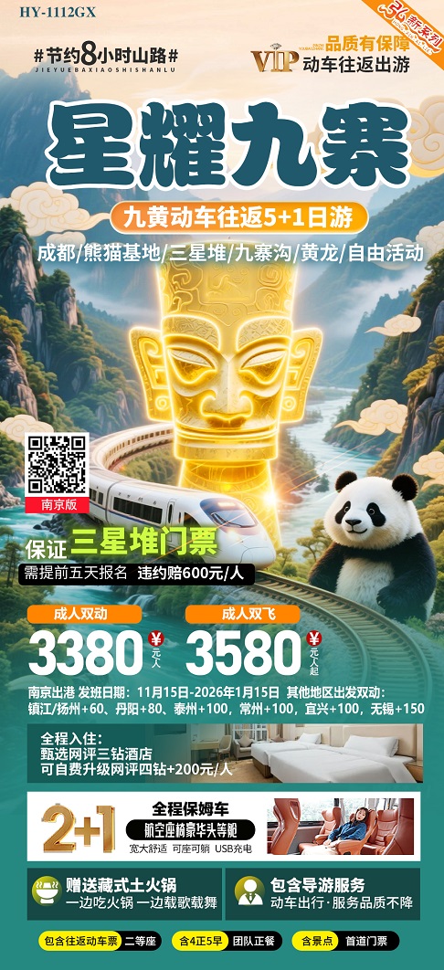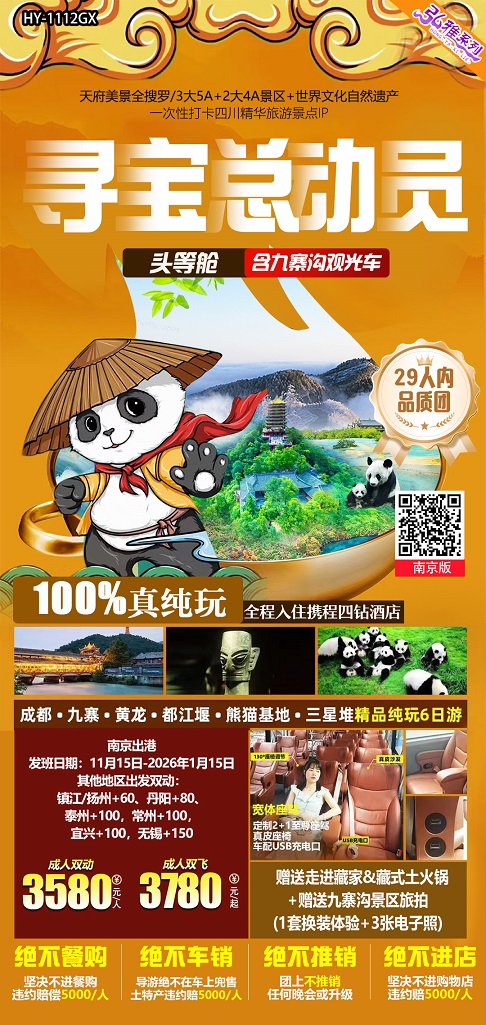 【寻宝总动员:成都自由行+九寨沟+黄龙+都江堰+三星堆+熊猫基地纯玩6日】.行程