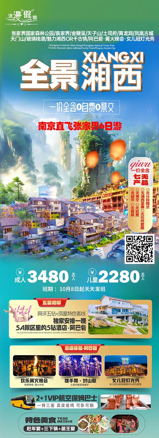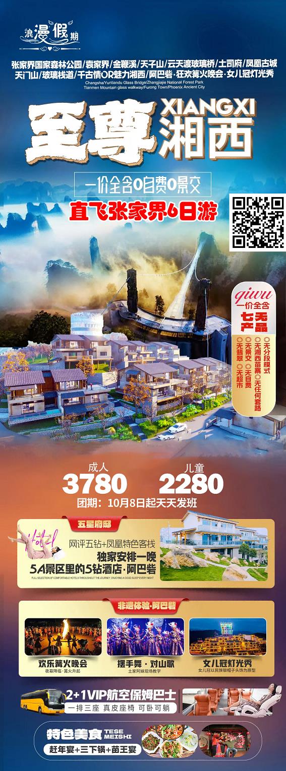 【全景湘西:张家界 天门山 黄龙洞 凤凰古城 民俗歌舞晚会双飞6日 0自费】.行程