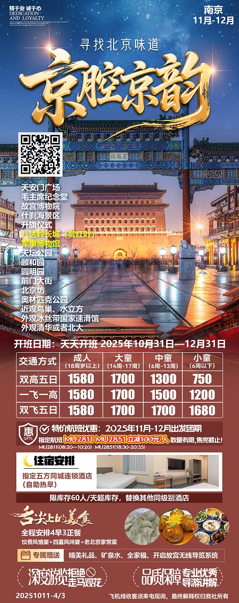 特殊说明:最后一天18:00后离团,若提前离团导致部分景区无法正常参观,我公司不承担任何责任,未产生费用在京导游现退客人。