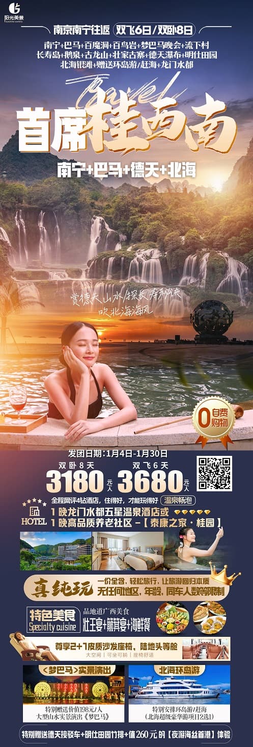 早餐后 ,前往游览前国家主席杨尚昆题词“天下第一滩 ”【北海银滩】( 电瓶车 20 元/人未含 ,游览时间不少 于 120 分钟 )‘’滩长平、沙细白、浪柔软、水温净、无鲨鱼‘’素有“东方夏威夷”的美誉 ,被评为国家 AAAA 级王牌风景区 ,浅海游泳 ,沙滩漫步 ,沙滩拾趣 ,阳光海水和沙滩。途经“北海客厅”之美誉的【北部湾广场】 、 【南珠魂】。