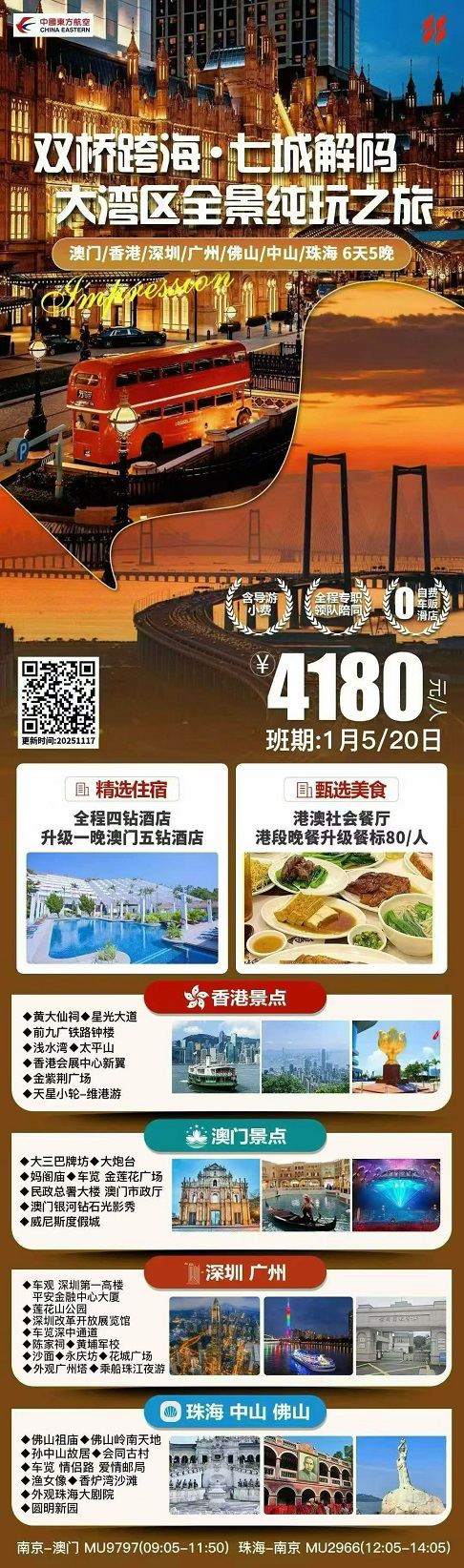 【粤港澳大湾区六城:香港 澳门 广州 佛山 中山 珠海5日游 0购物0自费】.行程