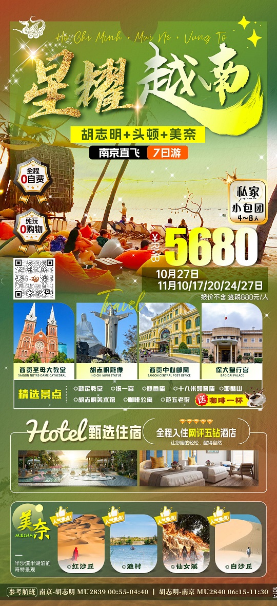 10-11月【星耀越南:胡志明 美奈 头顿5晚7天 4-8人小包团 南京直飞】6560元起