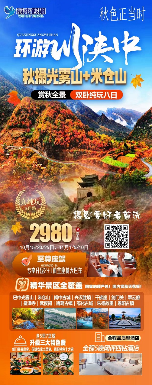 当前位置:首页 >> 国内长线 >> 10-11月【环游川陕双卧8日游:光雾山 西安 洋县 汉中 米仓山 千佛崖 剑门关 】2980元起