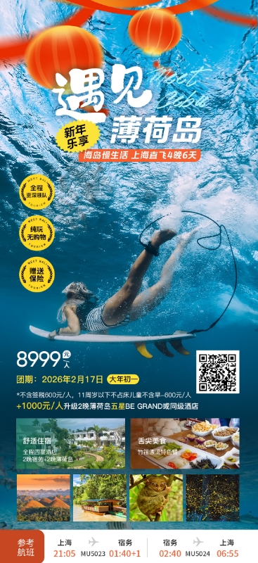 线路名称:2月17日春节【遇见薄荷岛:宿务薄荷纯玩4晚6日游 2天自由活动 上海直飞】8999元起