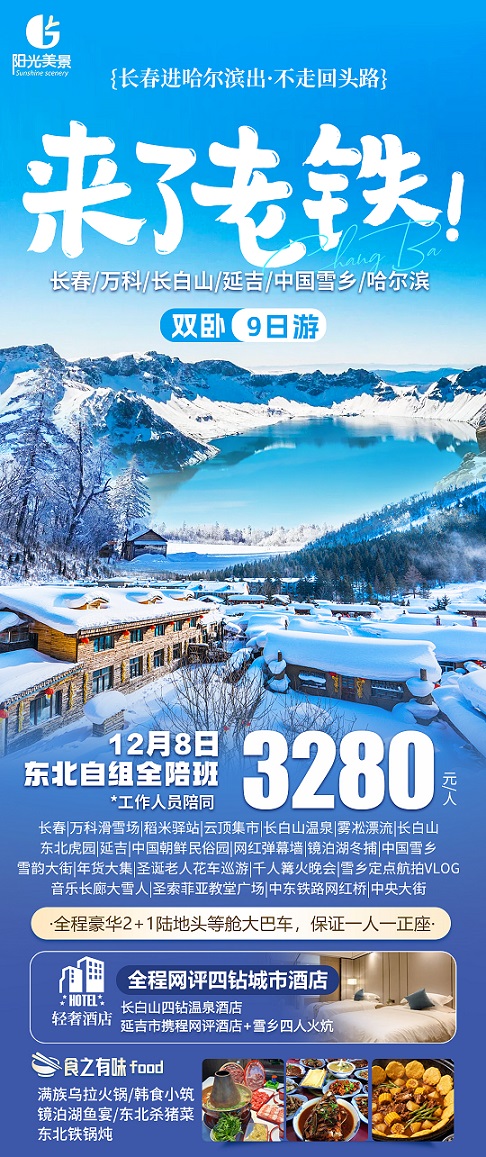 线路名称:12月8日【东北全陪班:长春 万科滑雪 延吉 长白山 童话雪乡 哈尔滨双卧9日游】3280元