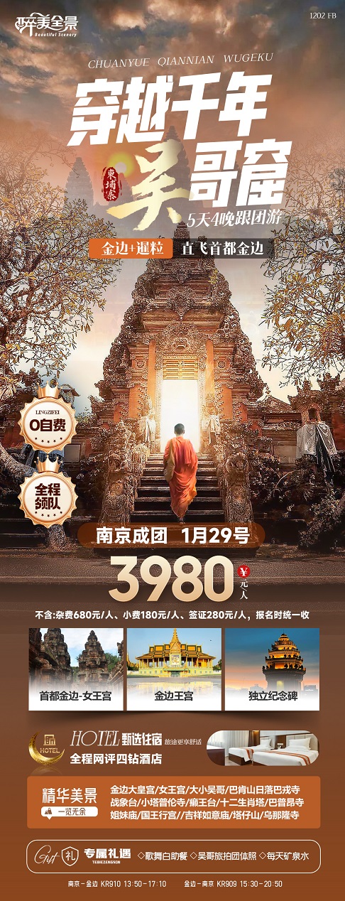 【吴哥窟】 , 吴哥窟又称吴哥寺、小吴哥(游览时间约 2.5 小时) 。位于柬埔寨西北方 ,原始的名字是 Vrah Vishnulok , 意思为“ 毗湿奴的神殿 ” , 中国古籍称为“桑香佛舍 ”。 它是吴哥古迹中保存得最完 好的庙宇 , 是整个吴哥古迹中最杰出、最辉煌的代表作 , 以建筑宏伟与浮雕细致闻名于世 , 也是世界上最 大的庙宇。 12 世纪时 , 吴哥王朝国王苏耶跋摩二世希望兴建一座规模宏伟的石窟寺庙 , 作为吴哥王朝的 国都和国寺。 因此举全国之力 , 并花了大约 35 年建造而成了此处古迹。主要景点有【护城桥】 、【主神 殿】 、【长廊】 、【千佛殿】 、【回音厅】 、【中心塔】 。