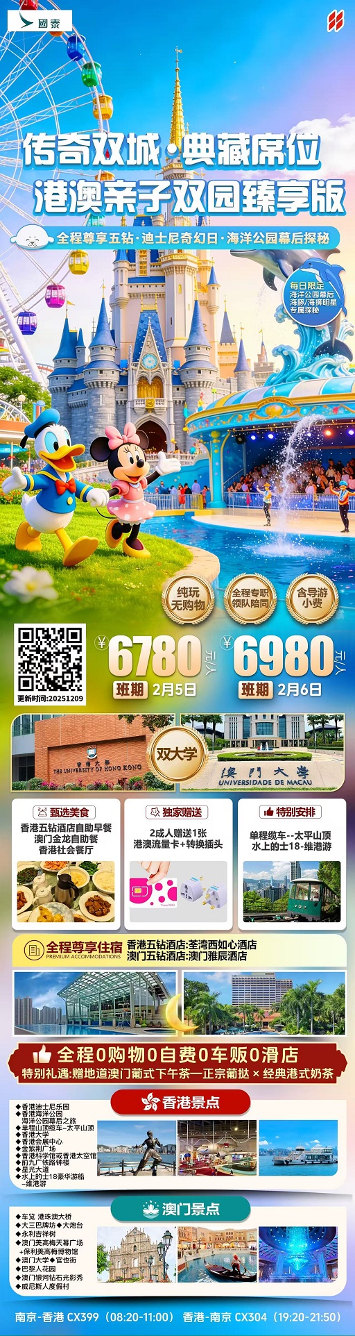 【港澳亲子双园:香港澳门+海洋公园+迪士尼+双大学5日游 0购物0自费】.行程