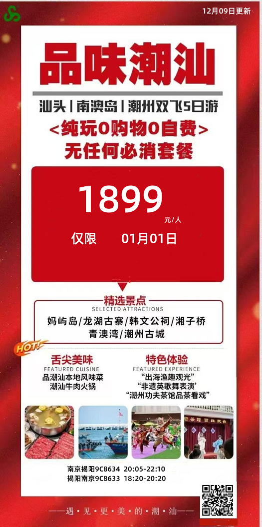 第5天:潮汕—南京9C8633/16:50-18:50(周246)/17:30-19:40(周1357)