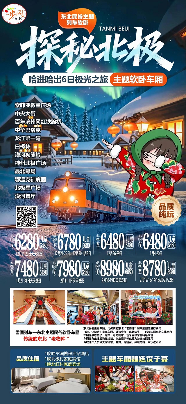 东方小巴黎哈尔滨-主题车厢软卧-漠河-北极星广场-松苑公园-北极村-北极沙洲-中国最北一家-鄂温克驯鹿园-龙江第一湾-乌苏里浅滩-北红村-真正的中国最北村庄6日 12人封顶拼小团