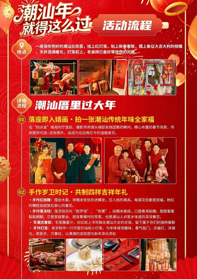 “在潮汕百年老厝里,感受张灯结彩的潮汕年,那一句熟悉的“妹啊,弟啊,回来了呀”,亲手制 作红桃粿,品一杯工夫茶,点亮自制的灯笼,围坐八仙桌品尝地道的年夜饭,在特设的背景墙拍一张值 得珍藏的全家福,放一串鞭炮回到我们的小时候……这里没有走马观花的游客,只有沉浸式的文化体验。 我们带你穿越时空,感受最地道的潮汕年味,让春节成为一场值得珍藏的记忆。”游客在百年老厝中触 摸潮汕春节的灵魂,从红桃粿的米香到潮汕老厝的韵味,从灯笼的暖光到烟花的绚烂,每一个细节都诉 说着“家”的温暖与“传承”的厚重。(特别赠送新春全家福一张,新春大桔一对,特色抽奖活动)