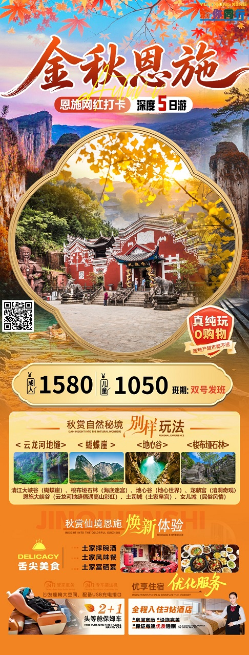 景区门票:恩施大峡谷(云龙地缝)+清江峡谷+梭布垭石林+地心谷+龙麟宫+土司城景点大门票(此项费用按下表在当地现付给导游);