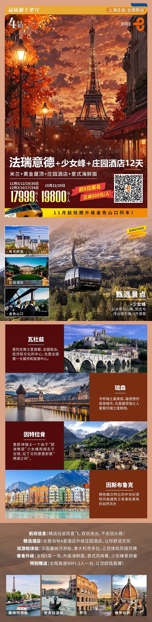 质品法国+瑞士+意大利+德国+少女峰+金色山口+庄园酒店 12天 9 晚(MU) CDG-VCE (4 钻)