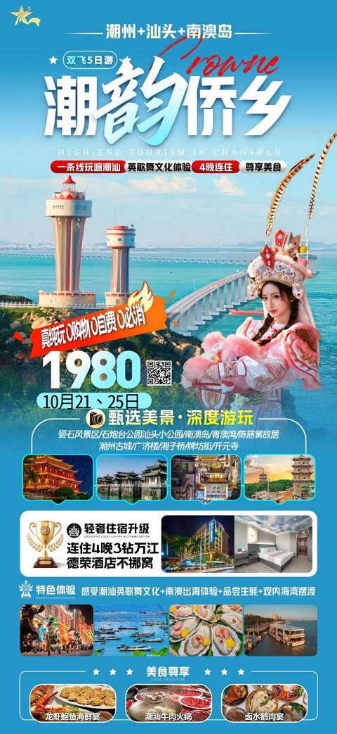 早餐后,车赴前往参观中国离海最近的潮汕历史文化博览中心(周一闭馆,参观时长约90 分钟)。一共汇聚 4 个潮人文化展馆:【潮汕非物质文化遗产展示馆】、【潮汕华侨历史博物馆】、【汕头市城市规划展览馆】和【汕头美术馆】(游览时间约90 分钟)等。博览中心以“潮都重器 ”为名,地上 5 层,地下 1 层,建筑高度 46.2 米。设计元素汇聚潮汕文化精髓,建筑风格取材自极具潮汕韵味的山海特色、红头船、潮汕民居, 形成“风起沙汕、潮送玉舟 ”,“花开四海、叶落归根 ”,“玉堂金殿、南滨新厝 ”,“鲲鹏展翅、遨游万里 ”四组具潮汕文化内涵的设计意象,为潮人之都增添文化重器。