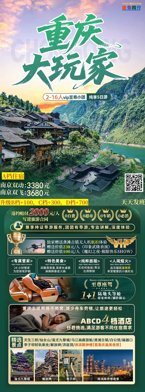 【特别告知】本行程洪崖洞为白天参观,若客人想观看夜景,可离团并和导游签好安全告知书,自行返回酒店(其中产生的打车费及其他费用自理)