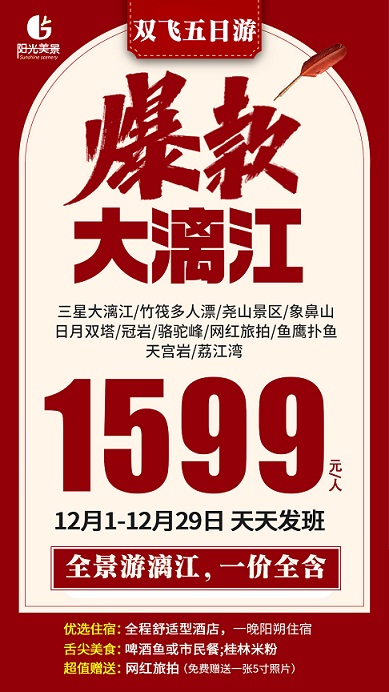 【4】用餐标准:全程用餐4早2正+1米粉(正餐30元/人/餐、其中一餐桂林米粉10元/人、10人一桌8菜1汤,如人数不足将酌情少菜量;若用餐人数不足6人导游现退餐费;早餐在酒店为赠送,不占床无早餐。若自愿放弃用餐,不退费用;