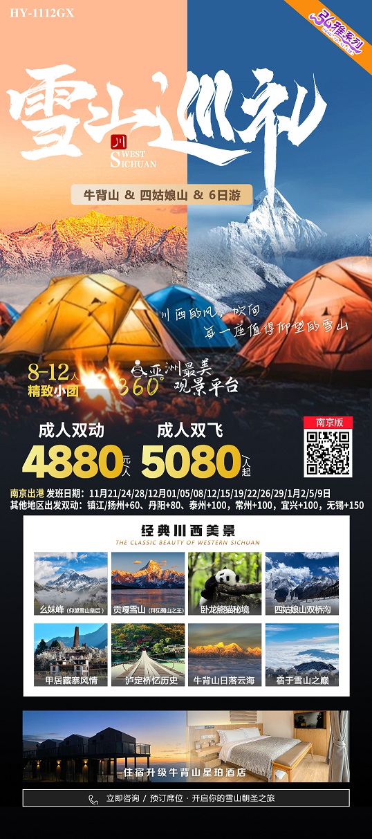 - 行程亮点:捕捉牛背山清晨“金色云海”,远眺“蜀山之王”贡嘎雪山 ,结束雪山之旅返程。