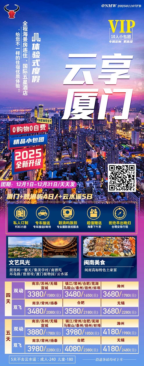 8、儿童:含往返大交通、当地正餐半餐费、车导费和鼓浪屿往返轮渡票(12 周岁以内)。若在当地产生其他费用, 敬请自理。