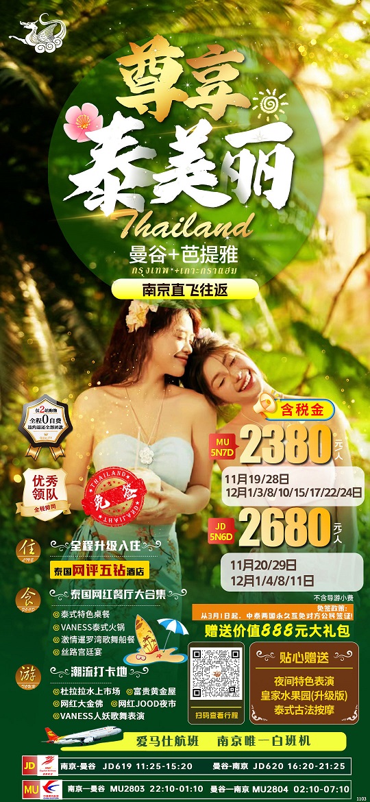 早餐后前往【大皇宫】这里汇集了泰国建筑、绘画、雕刻和装潢艺术的精粹。【玉佛寺】是全泰国唯一没有僧侣住持的 佛寺,但供奉着一座价值连城的国宝――由整块翡翠雕成的玉佛。(如因泰国政府公告关闭大皇宫及玉佛寺更换为 72 府)【金 山寺-天梯佛塔】它位于 78 米高的金山上。山顶的金山寺是泰国著名的佛寺,有 300 多年的历史,穿过丛林登上 318 阶梯的 旋转楼梯至山顶,一览曼谷全城风景。塔内珍藏有释迦摩尼佛的一颗舍利,从而也成为泰国乃至东南亚的佛教胜地,但前来 的游客不多,显得更加低调和宁静,不仅文化底蕴深厚也是小众拍照胜地,绝对是一个避开人挤人的团队游景点的首选之地。 【坐长尾船观网红大金佛】(游览约60 分钟)坐长尾船乘风破浪狂飙湄南河。船观:郑王庙、关帝庙、大金佛曼谷新地标— —耗资6 亿铢打造的69 米高的大佛,它是座皇家寺庙,坐落于曼谷的湄南河畔,在佛塔的最顶层有一座透着佛光的翡翠琉璃 佛塔,里面供奉着泰国九大圣僧之一龙婆术大师的佛骨舍利。欣赏【VANESSA人妖秀】(游览约60 分钟)欣赏享誉全球的泰 国国粹,雌雄难辨,精彩纷呈的演出,保证让你终身难忘。