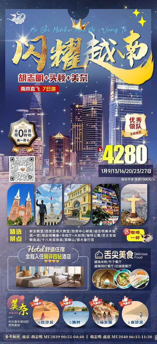 线路名称:12月-1月【越南:胡志明 美奈 头顿 芽庄 河内 南京直飞】线路报价