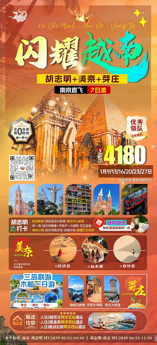 12月-1月【越南:胡志明 美奈 头顿 芽庄 河内 南京直飞】线路报价
