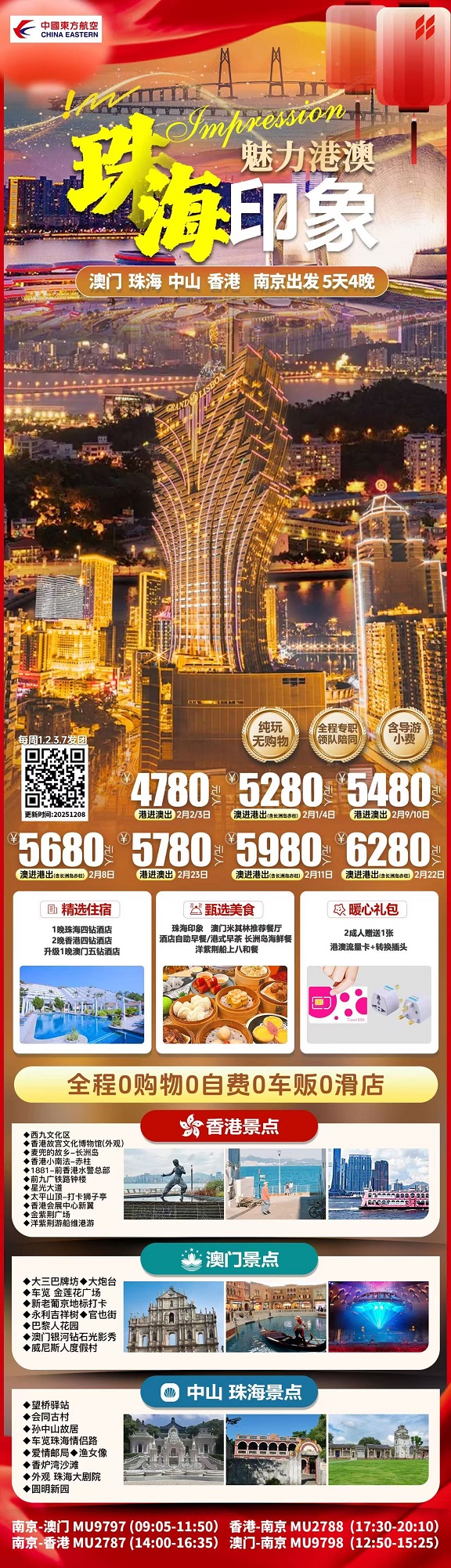 珠海印象 魅力港澳—纯玩品质5天4晚行程(南京起止 澳进港出MU)