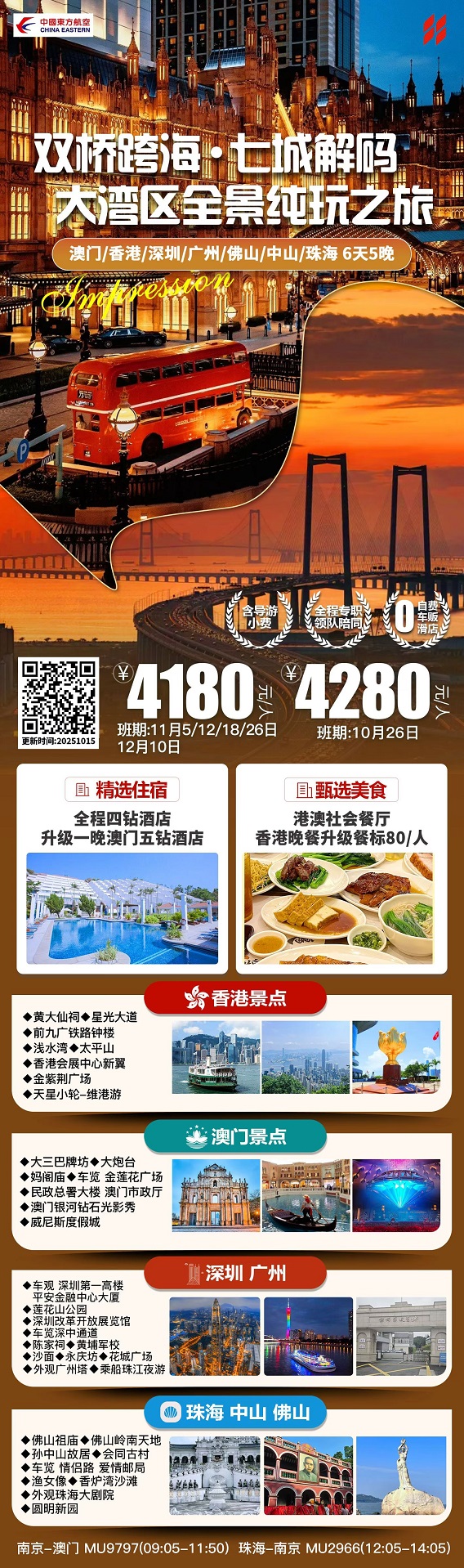 深圳 、广州 、佛山 、珠海四钻酒店 、澳门五钻酒店 (2 人 1 间);