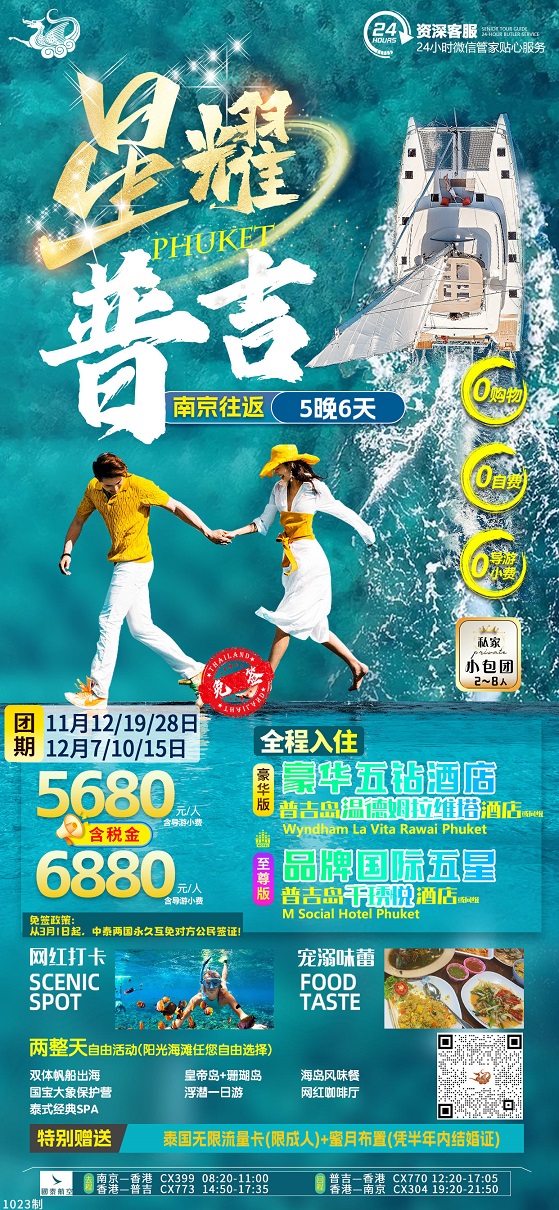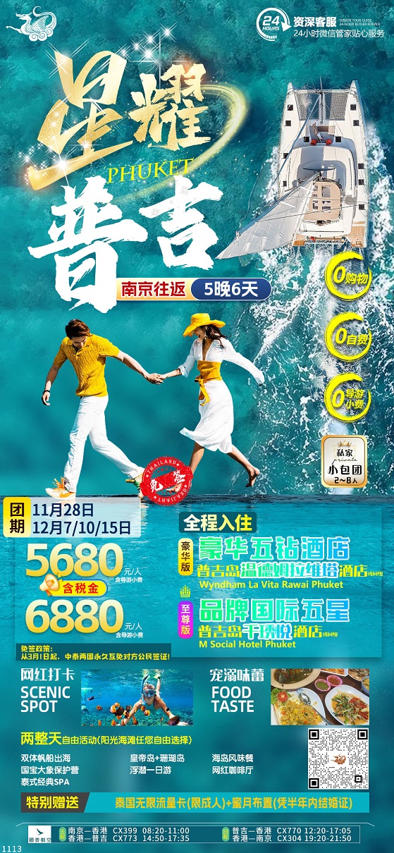 酒店内享用早餐,在导游安排下前往码头,乘上豪华双体帆船前往普吉的最后秘密海滩-【珊瑚岛】,您可在船上参加海钓,其四周的海域是浮潜和潜水爱好者必去之地,优质的珊瑚可以和马尔代夫媲美,一直以来都是欧美人士度假休闲的天堂。慵懒的白色沙滩反射着阳光,散发迷人的光晕。四周的海水里聚集了成千上万五彩缤纷的热带鱼。上岛后你可以躺在海边享受轻柔的海风或是去和海水来一次亲密的接触。在这里您可自费感受刺激好玩儿的香蕉船、拖伞、深潜等各类活动……也可以静静的趟在沙滩椅上享受阳光,岛上还有其他付费的娱乐活动供游客自主选择与旅行社无关。【皇帝岛】是普吉岛南端的一个附属小岛屿,岛上除了大片椰林外,就是茂密的原始森林。这个小岛属私人所有,所以岛上自然环境保护得非常好。整个岛的形状像一颗腰果,面积只有1平方公里,岛上的一切都是免费的,躺在那里,听着海的声音,睡个午觉非常棒。