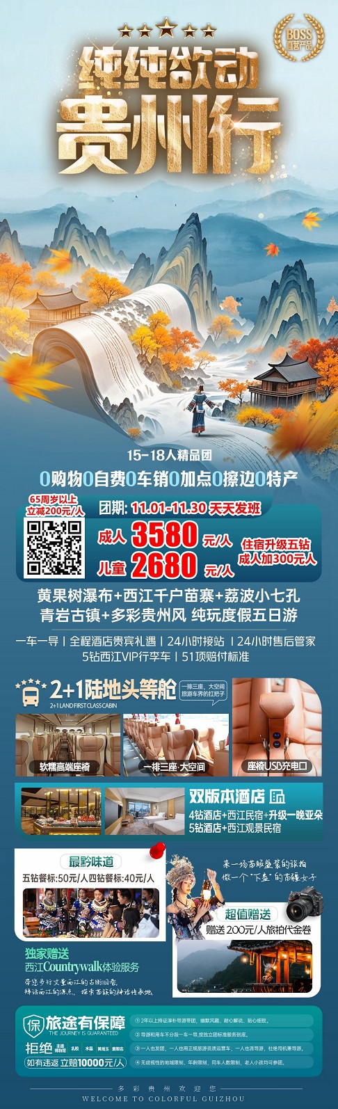1、返程大交通时间:建议贵阳航班16:00以后,火车/高铁16:30以后,以防不可抗因素而影响返程时间产生损失。