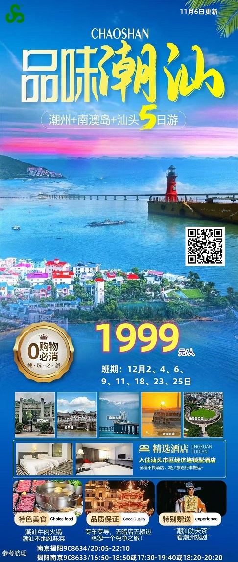 第5天:潮汕—南京 9C8633/16:50-18:50(周246)/17:30-19:40(周1357)