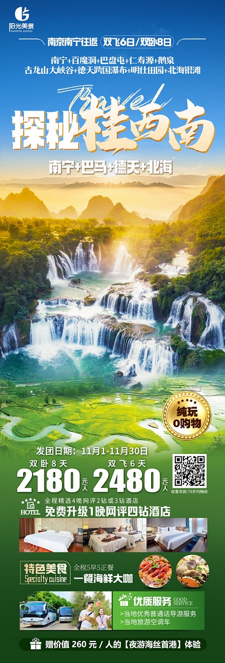 当前位置:首页 >> 国内长线 >> 11月【广西:南宁 北海 德天瀑布 巴马 涠洲岛 柳州】线路及报价