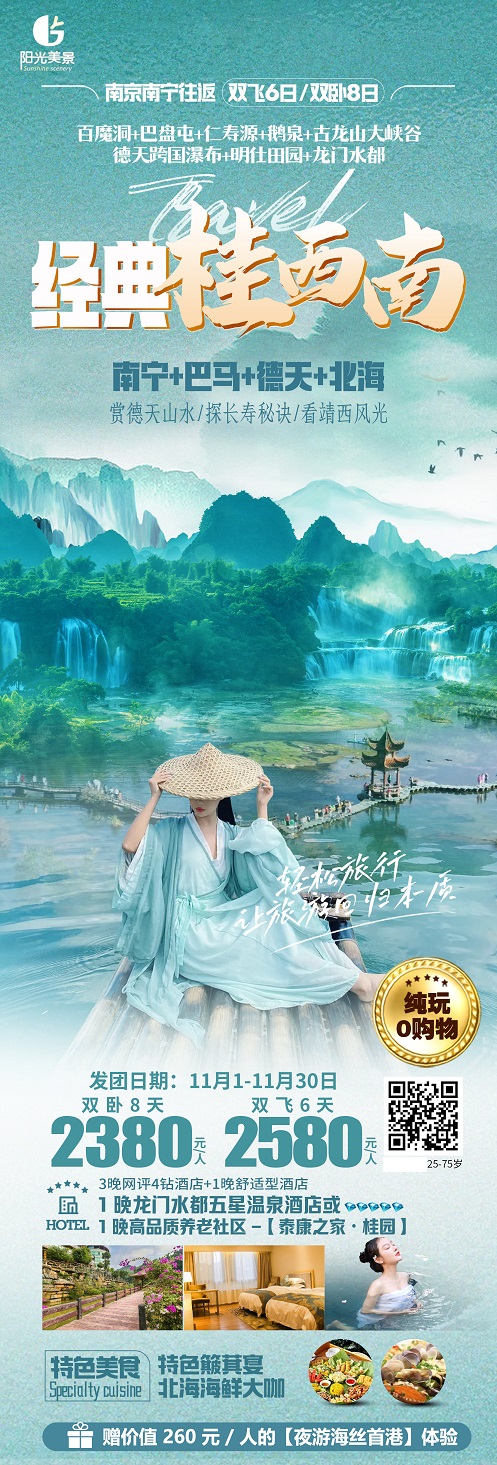 线路名称:11月【广西:南宁 北海 德天瀑布 巴马 涠洲岛 柳州】线路及报价