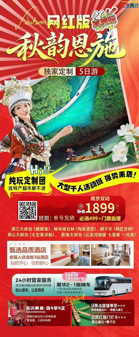 清江大峡谷(蝴蝶岩)、梭布垭石林(海底迷宫)、狮子关(网红浮桥)屏山大峡谷(太空悬浮船)、土家女儿城(民俗狂欢)恩施大峡谷(云龙河地缝 七星寨 一炷香)5日游